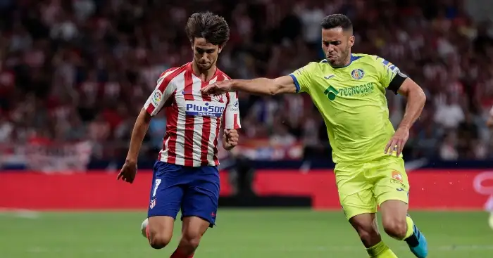 Fayçal Fajr tries to protect his midfield colleague by wiping out the Atleti man as early as possible, only to end up being forced to shuffle off and leave João Félix too it – it’s the equivalent of a cornered superhero ducking the attack of one henchman and watching them careen into another.