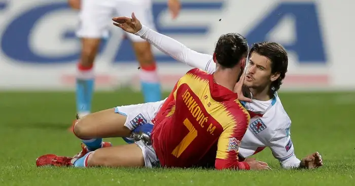 Montenegro’s Marko Jankovic and Olivier Thill of Luxembourg were scrapping for the ball in the middle of the pitch; Jankovic having already evaded one wild tackle.